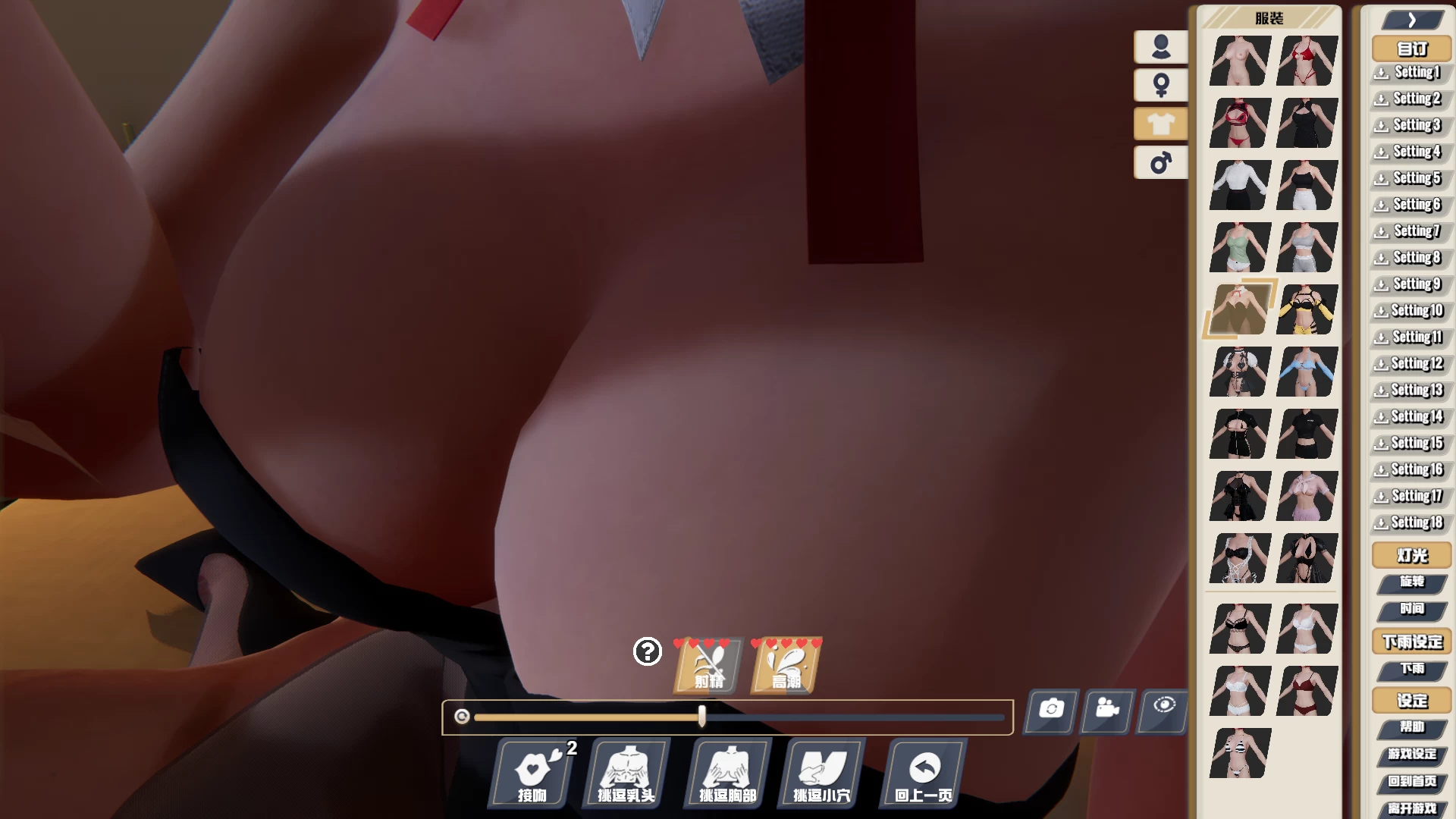 在同居的过程,玩家可以在三个地点和Reika发生杏爱关系,每个地点各有